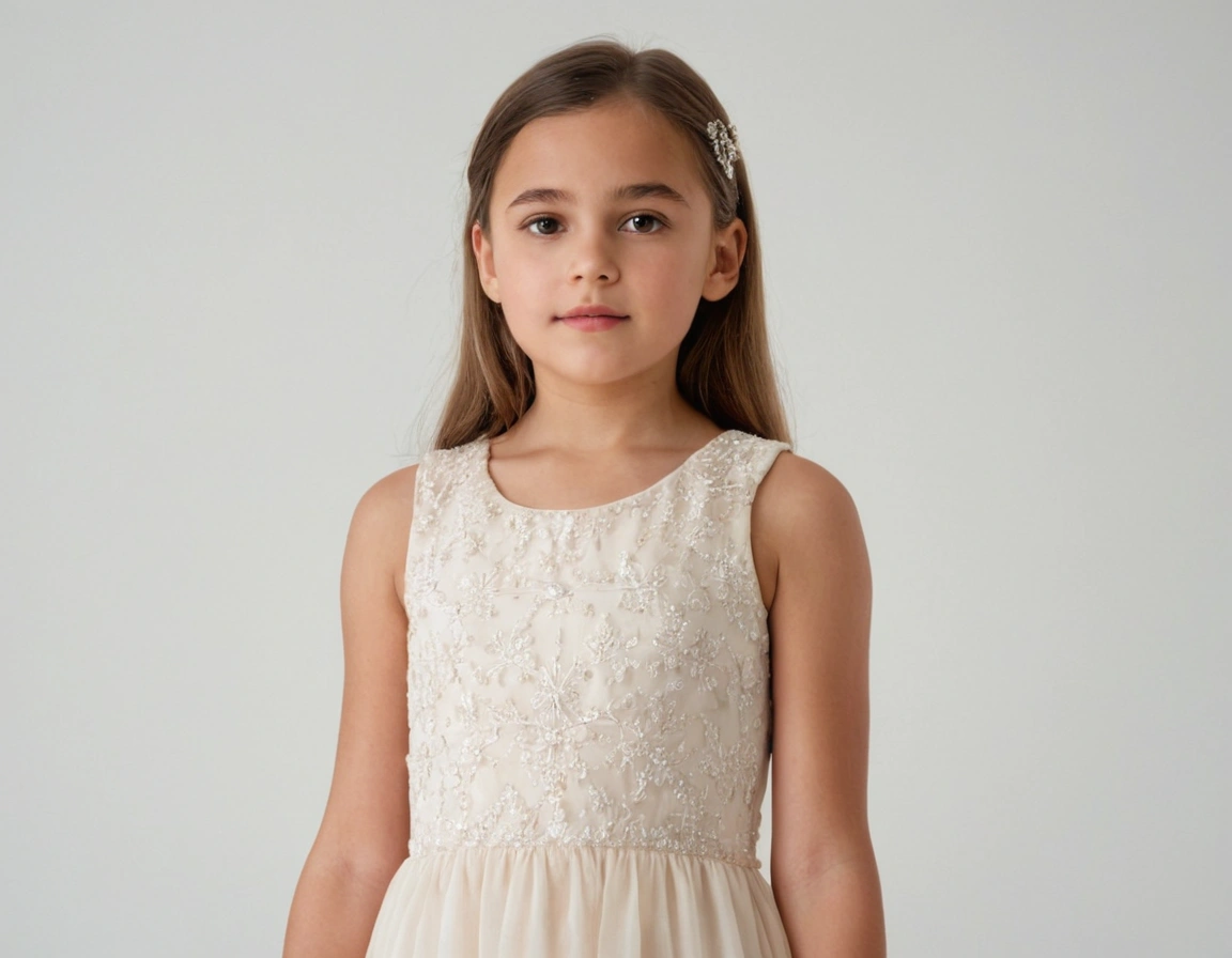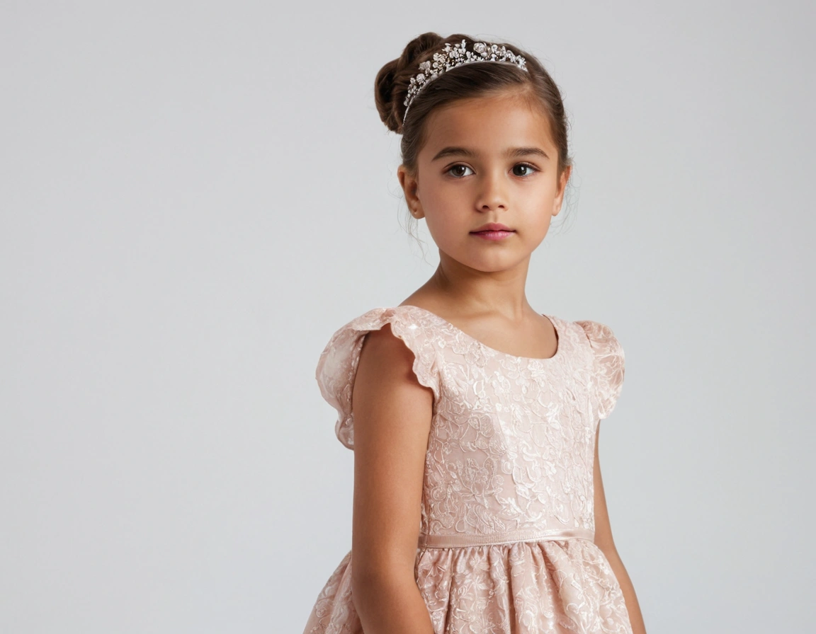 Vestido elegante para niña con detalles de encaje y falda con vuelo. Perfecto para fiestas, cumpleaños o celebraciones especiales.